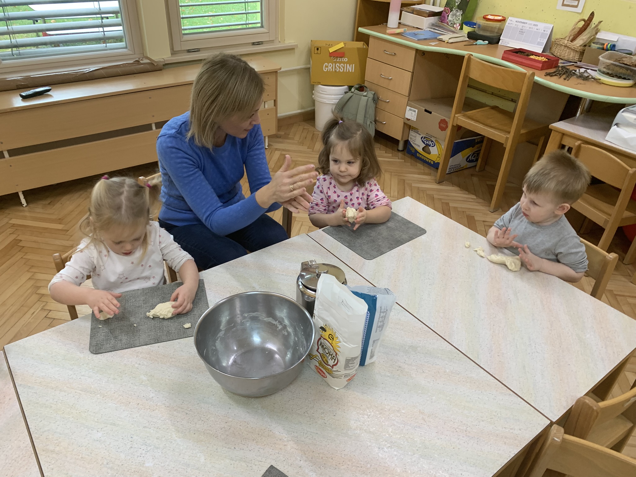 V mlajših skupinah smo ustvarjali in se igrali s slanim testom ter ga oblikovali v različne oblike – pekovske izdelke. Ob listanju reklam so si otroci ogledovali sličice različne hrane, se pogovarjali o tem, kaj radi jedo, poimenovali različna živila ter tako širili svoj besedni zaklad. V starejših skupinah so otroci sodelovali pri pripravi zdrave malice in tako pripravili jabolčni kompot, čežano in jabolka s cimetom.