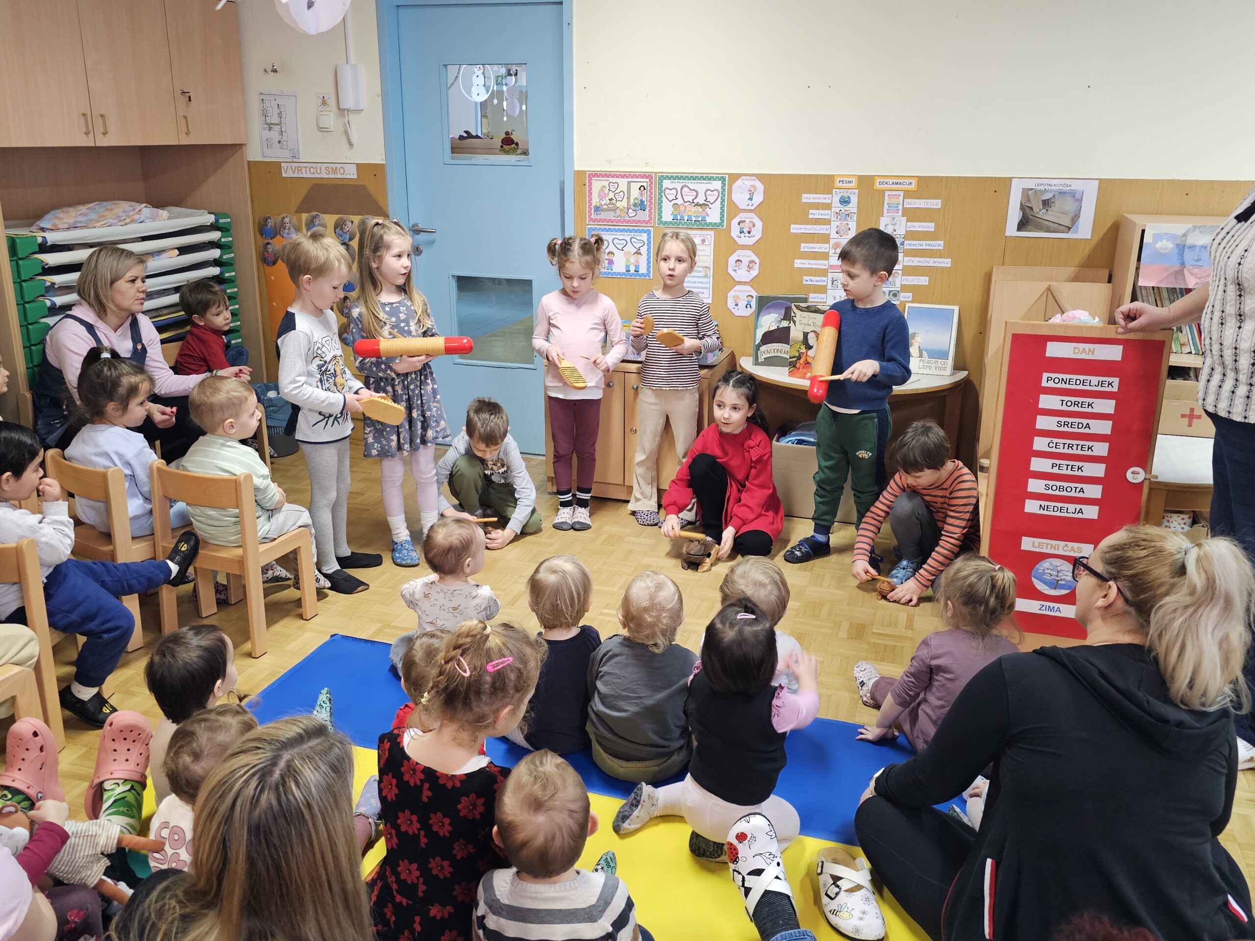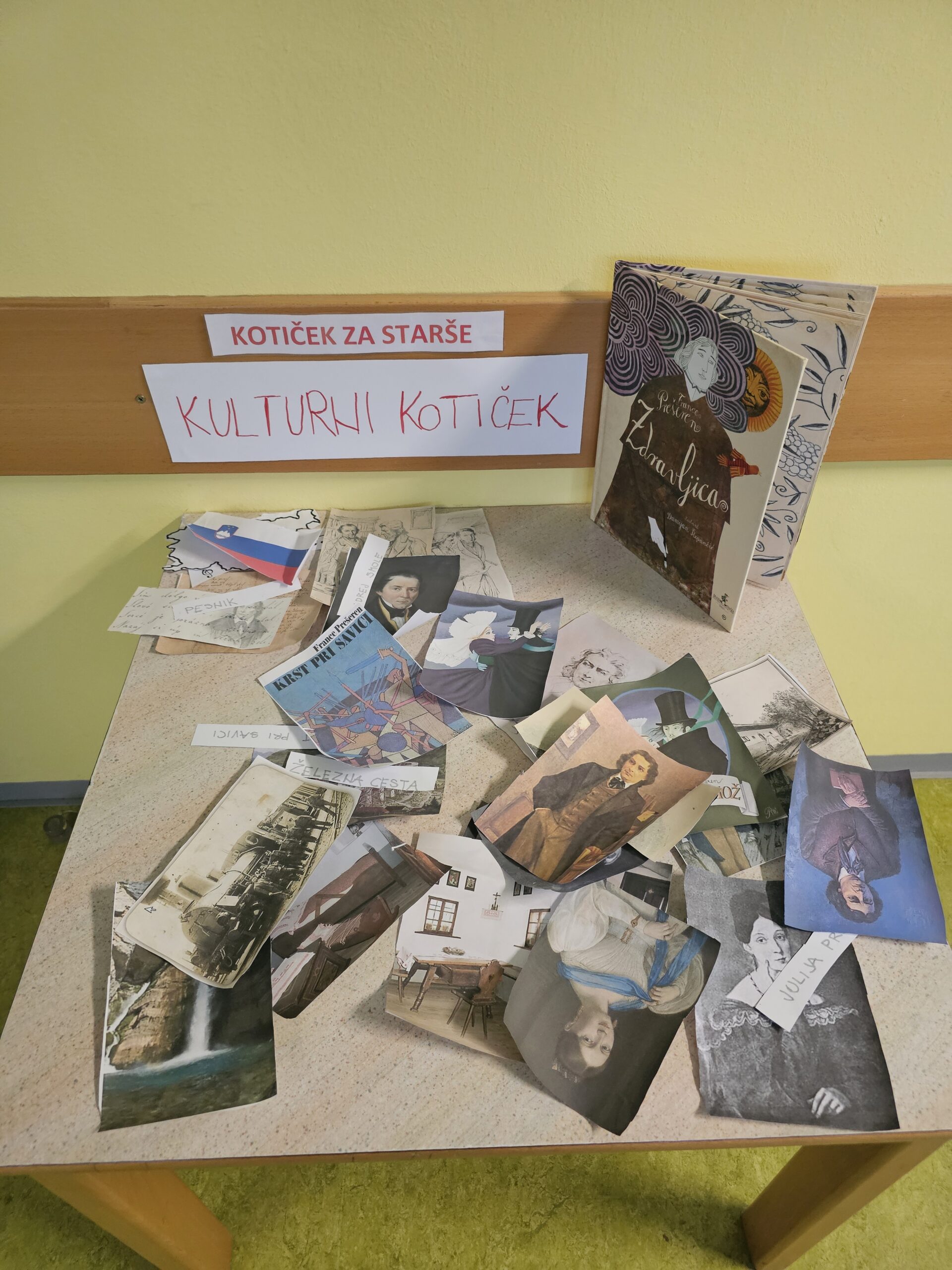V garderobi smo skupaj uredili kulturni kotiček, kjer so bili razstavljeni portreti, knjige in likovna dela otrok. Teden smo popestrili tudi s plesom ob slovenski glasbi, ki je v prostore vrtca prinesel veselje in gibanje.