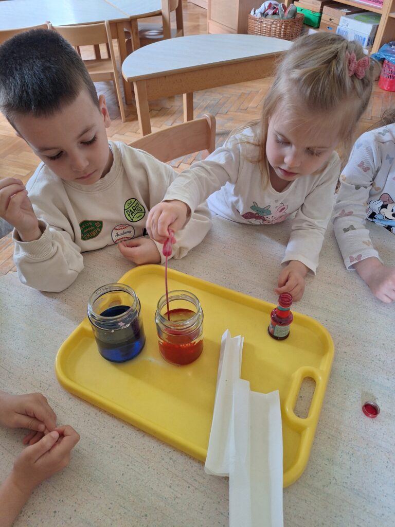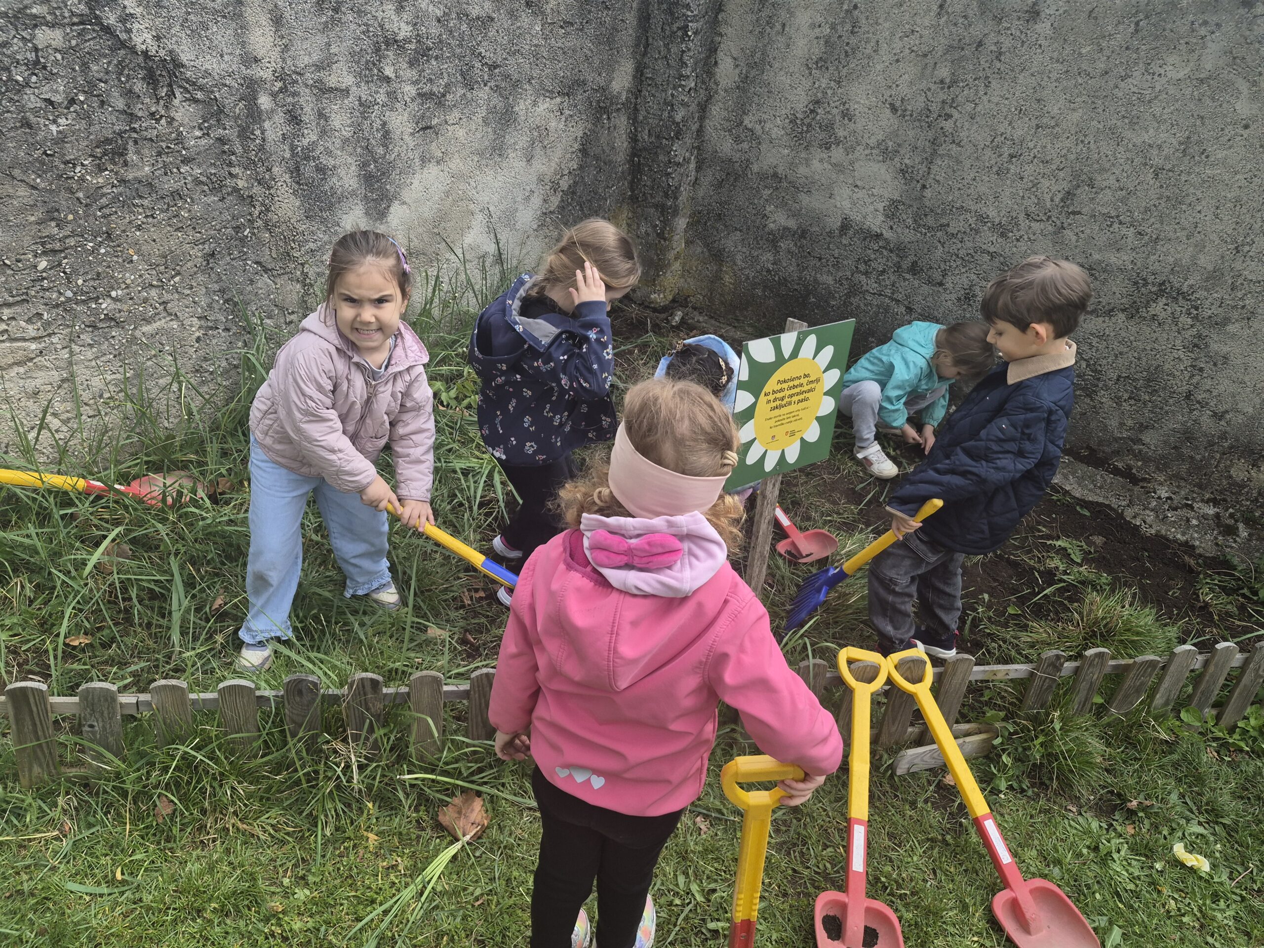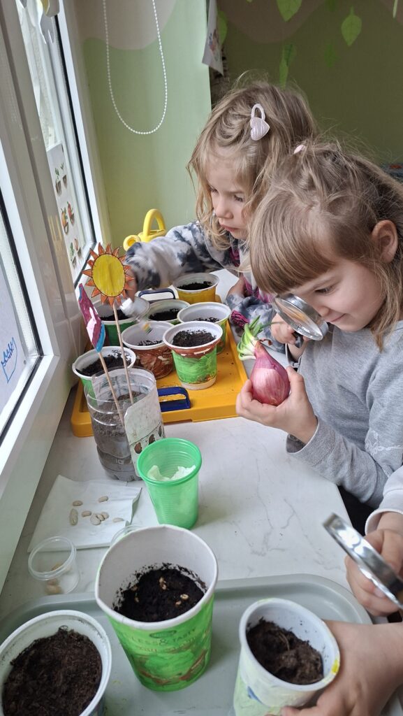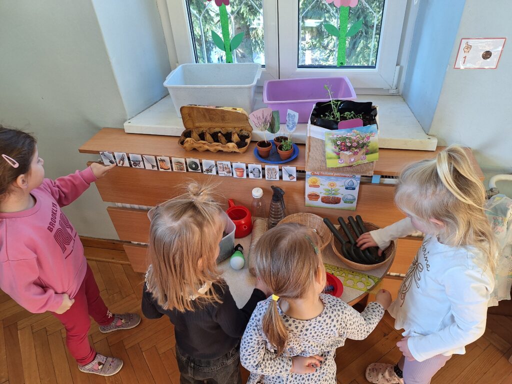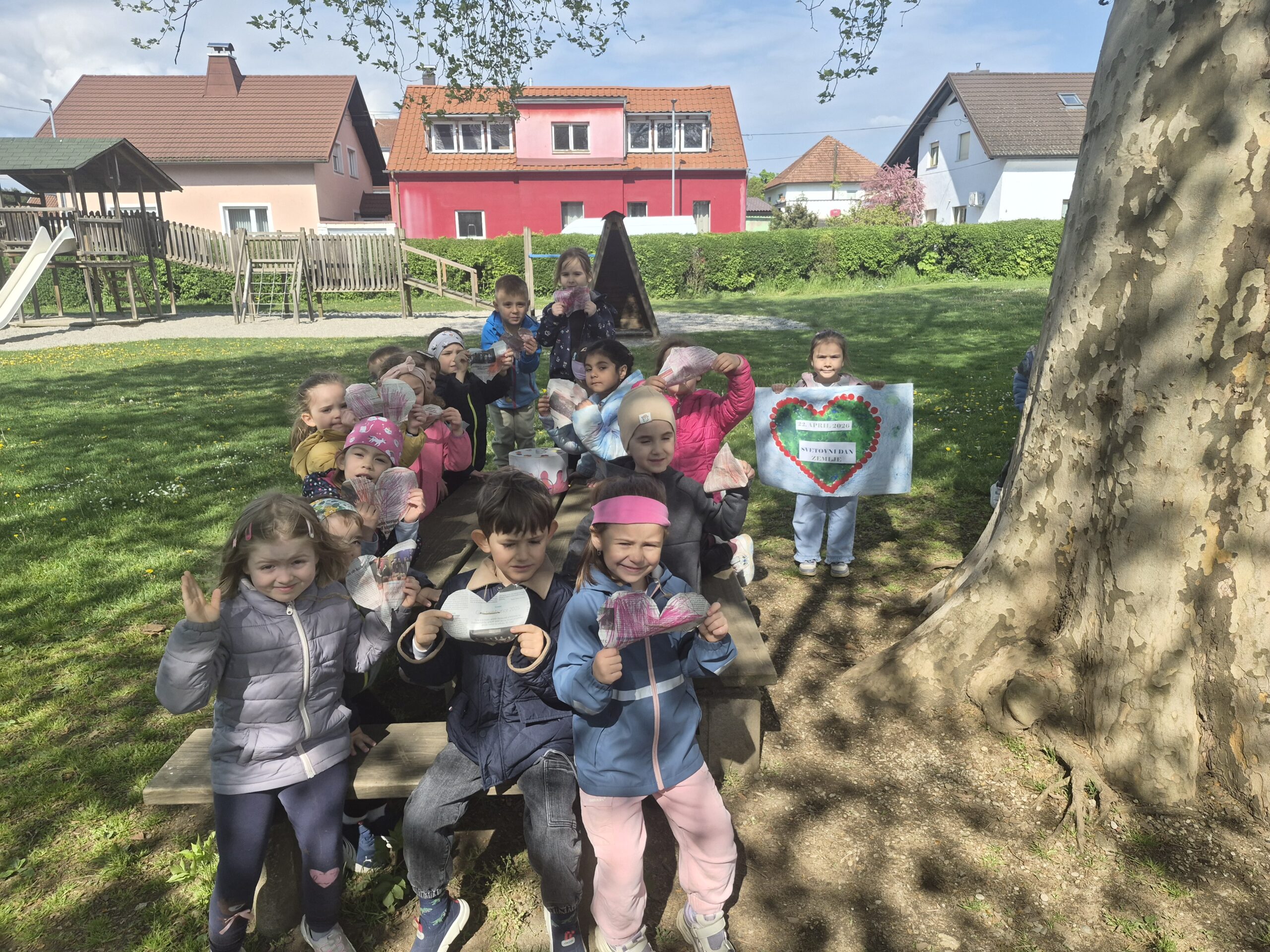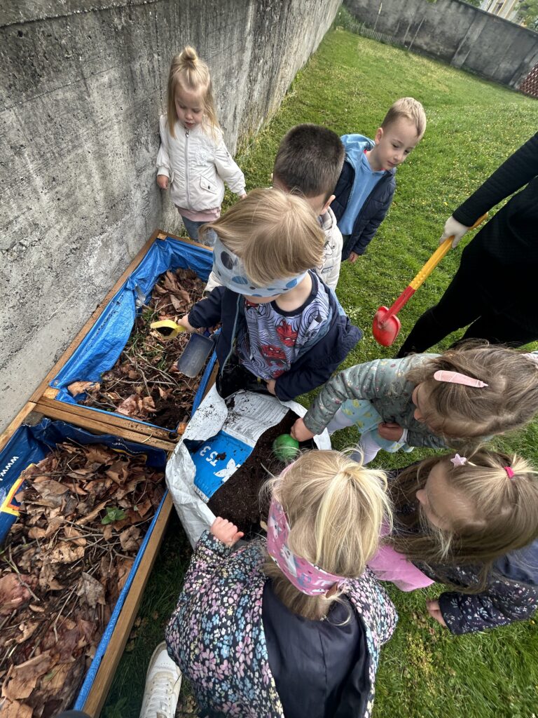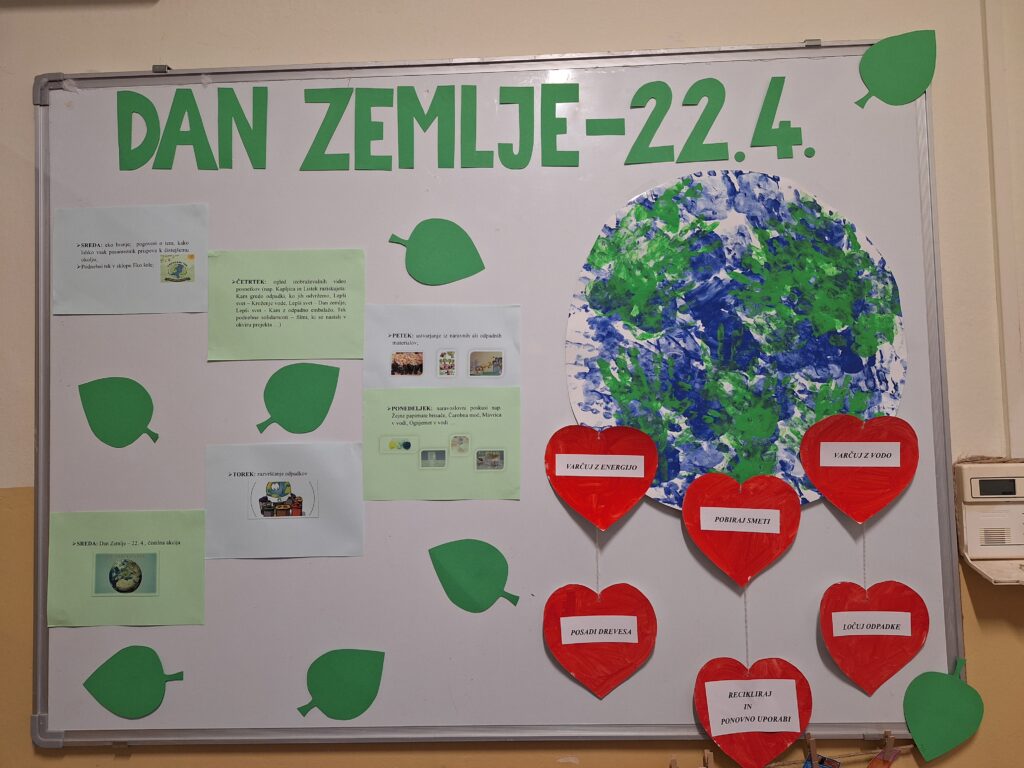 V tednu dejavnosti ob dnevu Zemlje smo otroke spodbujali k razumevanju, da je Zemlja naš skupni dom, za katerega skrbimo vsi. Skozi eko branje, pogovore, pripravo podnebnega teka so otroci razmišljali o tem, kako lahko posamezniki prispevamo k čistemu okolju. Z ogledom izobraževalnih videov so spoznali kam gredo odpadki in kako kroži voda, pri likovnem ustvarjanju pa so uporabili naravne in odpadne materiale. V igralnicah smo pripravili naravoslovne kotičke za vrtnarjenje, kjer so otroci spoznavali rast rastlin in skrb zanje. Veliko zanimanja so pokazali pri naravoslovnih poskusih in pri matematični igri ločevanja odpadkov. Teden smo zaključili 22. aprila s čistilno akcijo, ureditvijo gredic in pripravo visokih gred za zasaditev. Otroci so pridobivali nova znanja o varovanju okolja, razvijali naravoslovno razmišljanje ter se učili kako lahko z majhnimi dejanji prispevajo k ohranjanju narave.